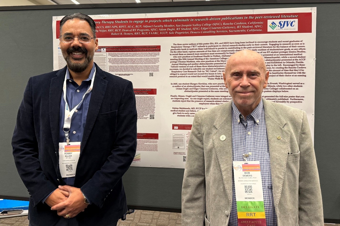 Robby Nijjar (Respiratory Therapy Dean) and Bob Demers (Consultant) presented their research poster during the American Association for Respiratory Care (AARC) International Congress and Exhibition in Phoenix on 12/6/25. The poster showcases collaborative research conducted by faculty and students at the Rancho Cordova, CA campus. Rafael Antanesian (Faculty), Adam Dughi (SJVC student) and Edgar Cisneros-Gutierrez (SJVC student). The research abstract and accompanying poster were submitted to the AARC Open Forum Evaluation Committee, which reviews hundreds of abstracts from around the world and selects only those of particular interest. The committee validated the quality of the research and recognized our students’ efforts by selecting the poster for display at the annual AARC Congress and Exhibition.